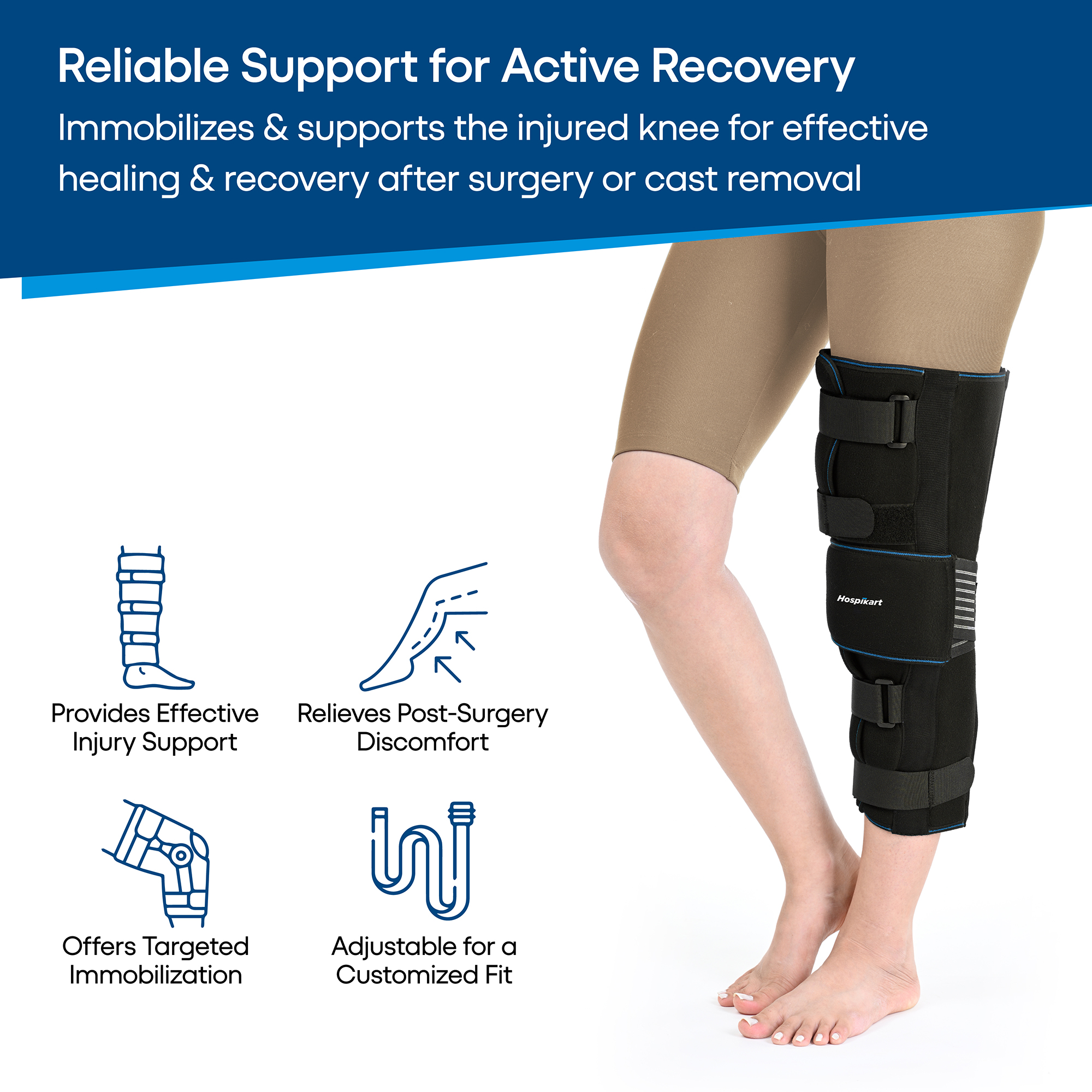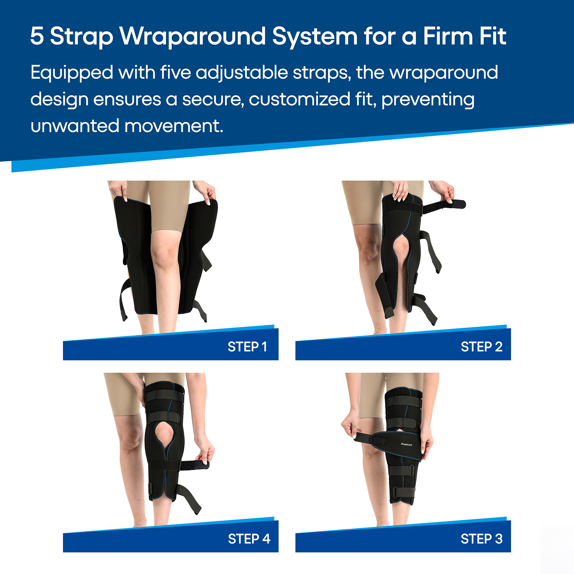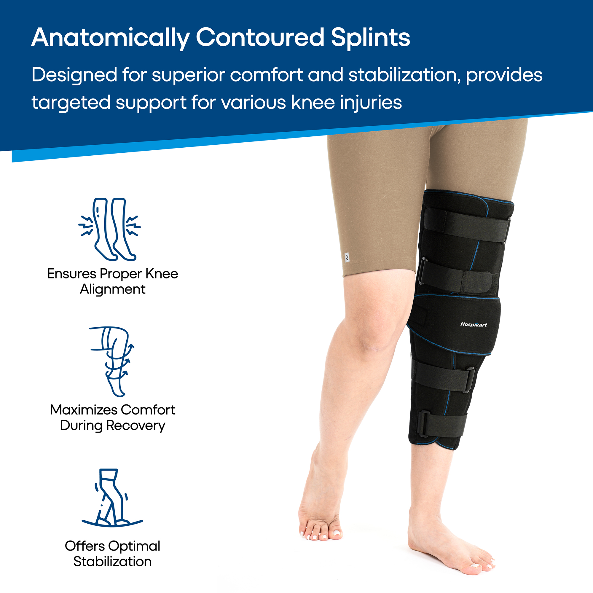 The Knee Immobilizer Brace is designed to provide secure support and immobilization for knee injuries, including dislocations and ligament tears, promoting stability and pain relief during recovery. It features contoured splints that ensure effective knee stabilization while offering superior comfort. The five-strap wraparound system allows for a customizable, firm fit, providing better grip and preventing unwanted movement. With its anti-slip, cushioned design, the brace stays securely in place, allowing you to wear it comfortably for long periods. Lightweight and washable, this brace is easy to apply, remove, and maintain, providing reliable support for everyday use.