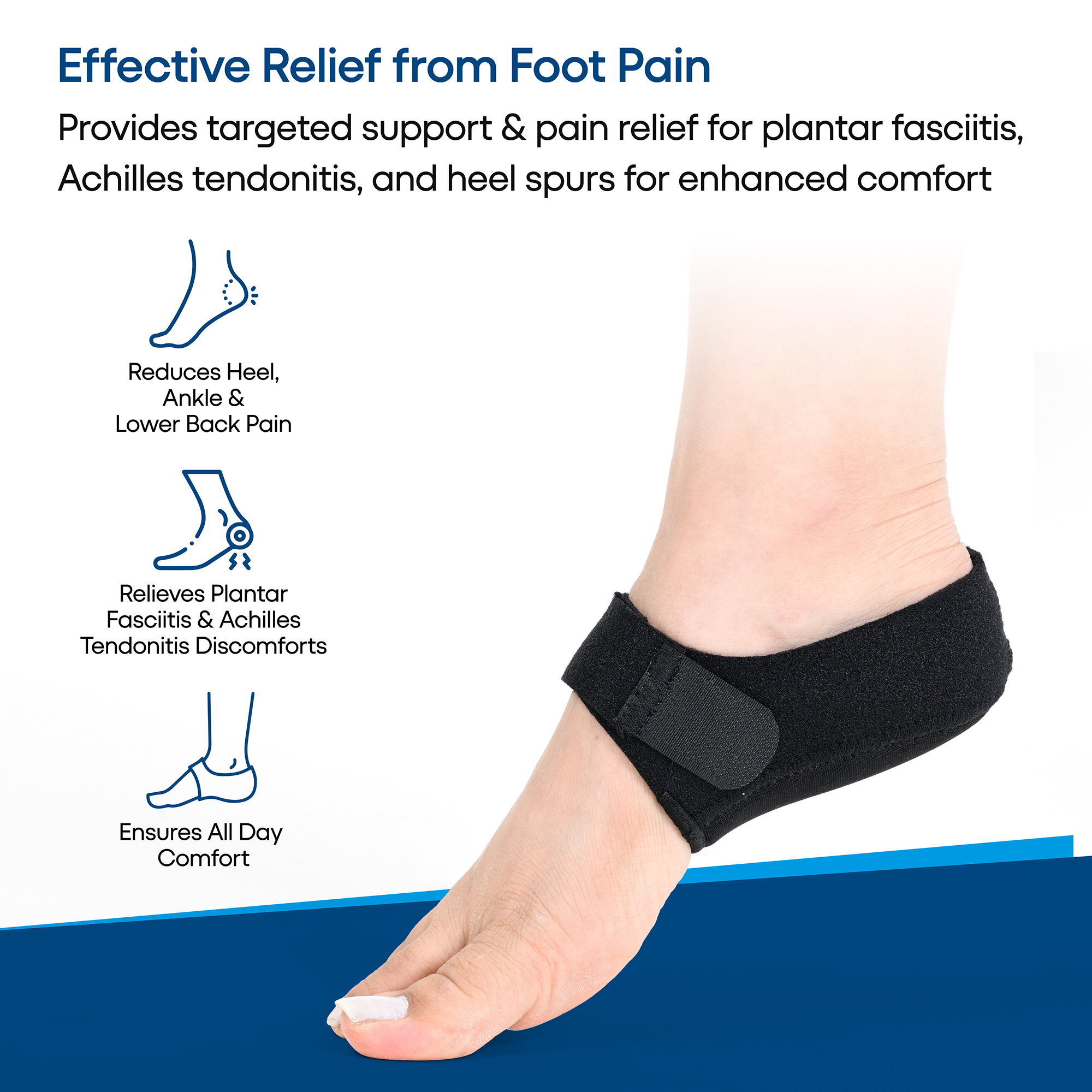 The Heel Cup Sleeve provides effective foot pain relief for conditions like plantar fasciitis, Achilles tendonitis, and heel spurs, alleviating pain in the heel, ankle, and lower back. Featuring premium silicone gel padding, it absorbs shock and reduces muscle fatigue, offering all-day comfort for feet, knees, and back. This expert-approved design is trusted by specialists and is suitable for both men and women. The breathable, non-slip design with moisture-wicking neoprene and an adjustable strap ensures a secure, comfortable fit. Enjoy superior heel protection with advanced shock absorption and pressure relief. Ideal for conditions like flat feet, high arches, and heel spurs, it provides ultimate comfort and support.