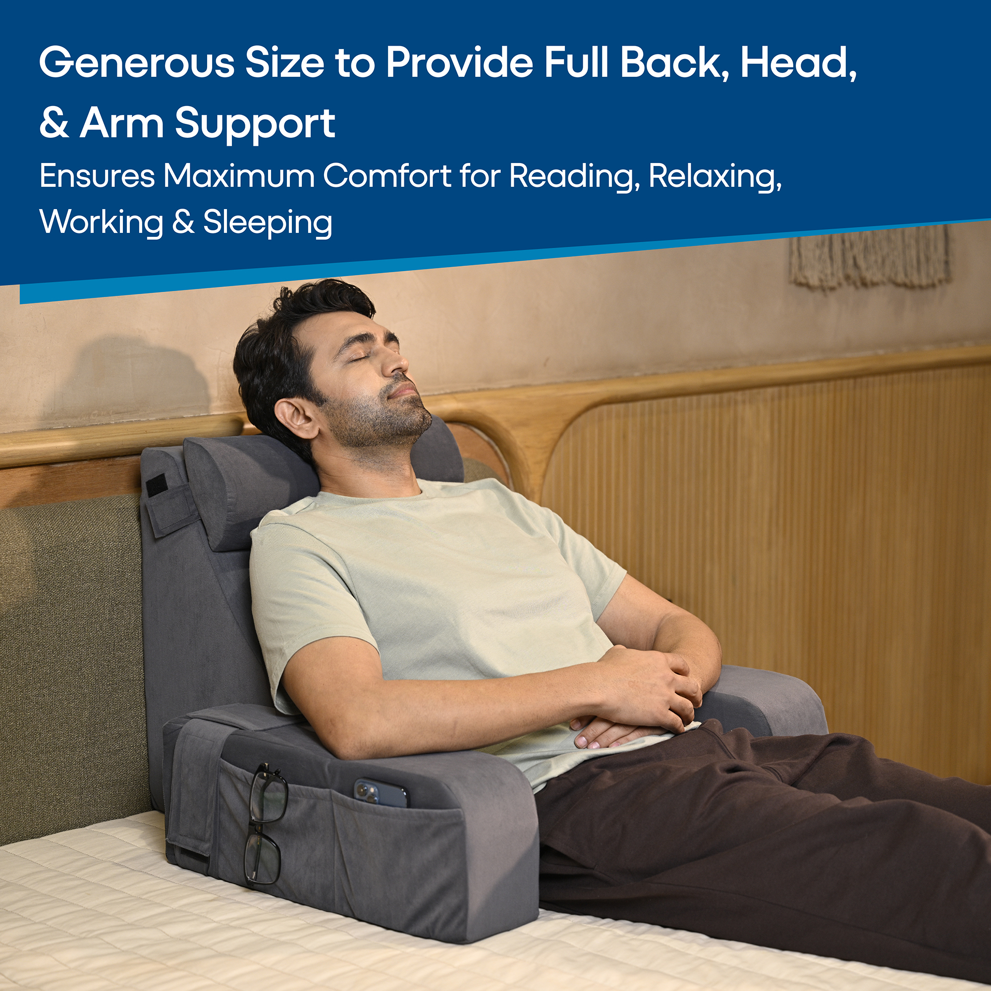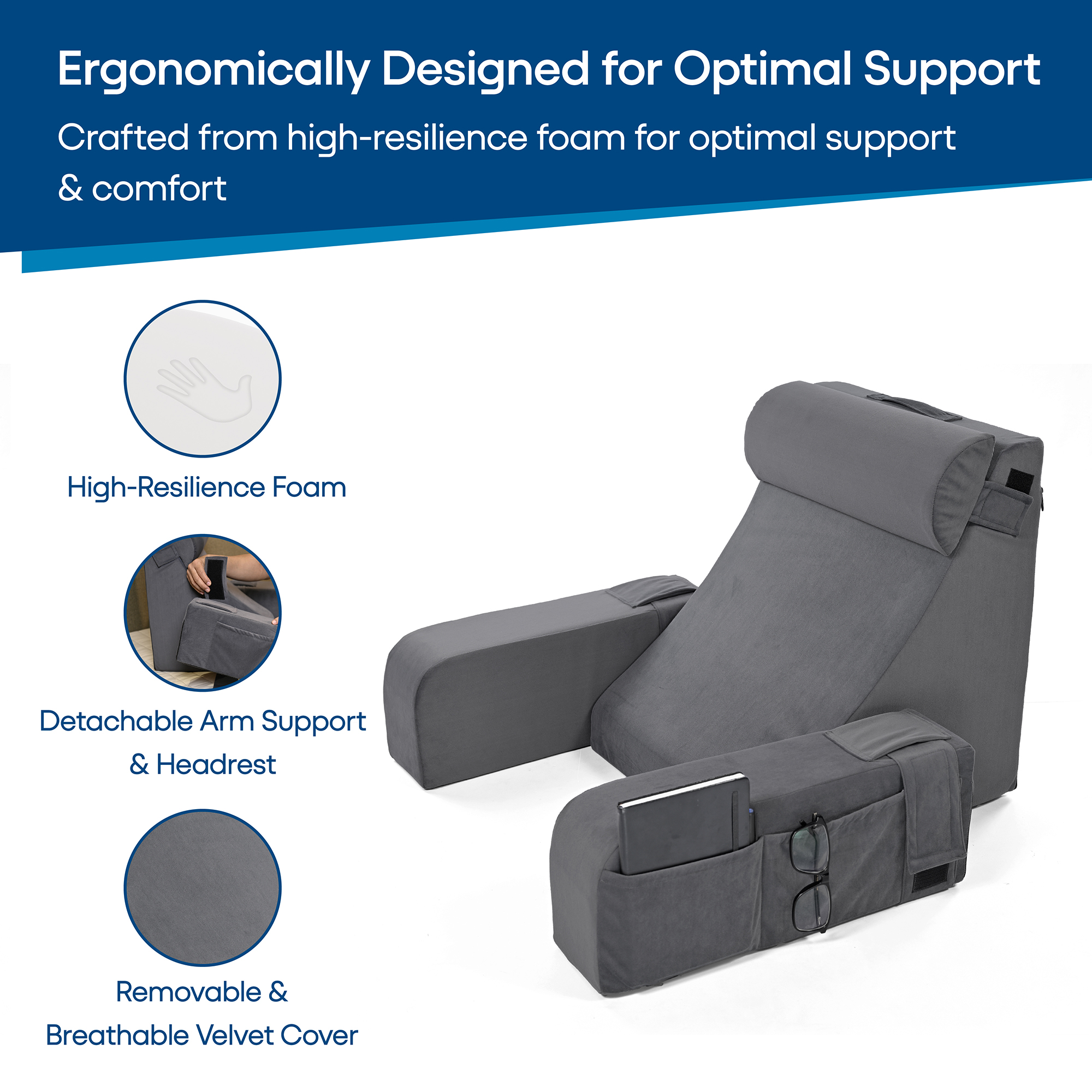 The HOSPIKART Reading Pillow is your ultimate companion for comfort and support during reading, working, or relaxing in bed. Designed with high-resilience foam, it offers firm yet cozy back support, while the padded armrests and integrated headrest provide superior comfort for your arms, elbows, and neck during extended use. The soft velvet cover adds a touch of luxury to your space and is removable and machine-washable for effortless maintenance. Lightweight and equipped with a sturdy handle, this backrest pillow is easy to move and versatile enough for use in bed, on the couch, or on the floor. Whether you’re enjoying a book, working on your laptop, or simply unwinding, the HOSPIKART Reading Pillow ensures optimal support and relaxation. Available in an elegant grey color, it’s a stylish and functional addition to any room.